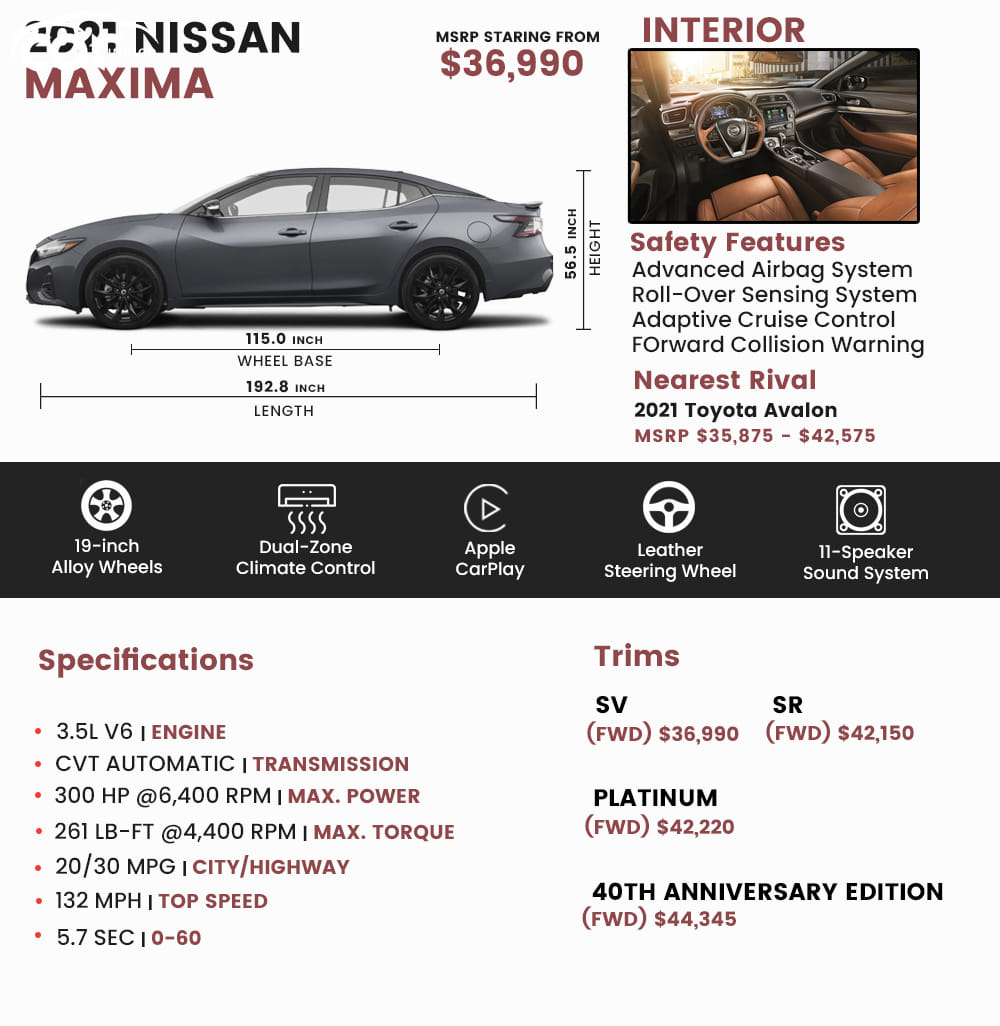 The roof of the Nissan IMs only sits 01 inches lower than the Infiniti QX30 crossover. 2022 Nissan Maxima is available in three trims exclusively- SV SR and Platinum. 2021 Nissan Maxima SR specifications.